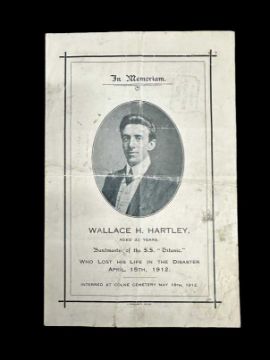 Extremely rare In Memoriam funeral programme for Titanic Bandmaster Wallace Hartley's funeral on May 18th 1912, printed by J. Buckworth of Colne. 5½ins. x 8½ins.