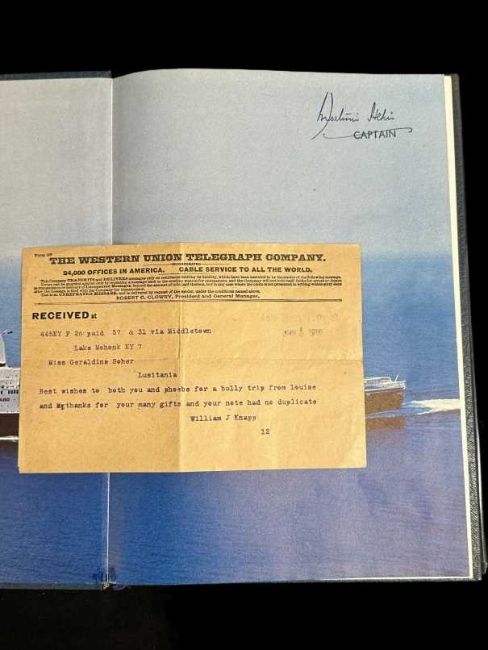 R.M.S. Lusitania telegram dated 1910, plus a hardbound Queen Elizabeth 2 1975 World Cruise book.