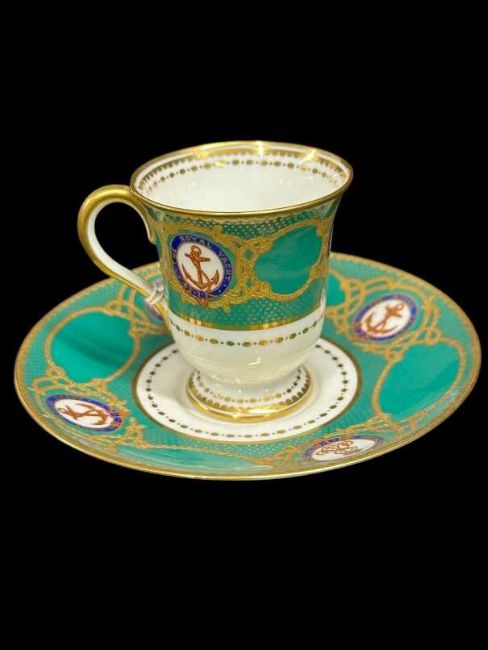 H.M.Y Victoria and Albert III green pattern Tasse de Glace cup and saucer, King's cypher and alternating Royal Yacht fouled anchor crest, fine handpainted detailing, Edward VII, manufactured by Spode and retailed by T. Goode. 3ins.