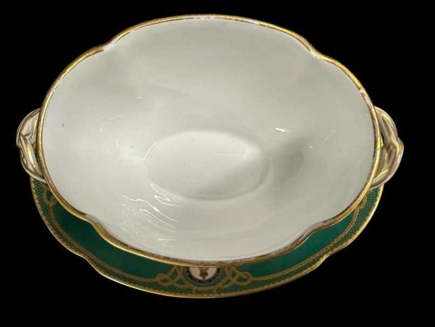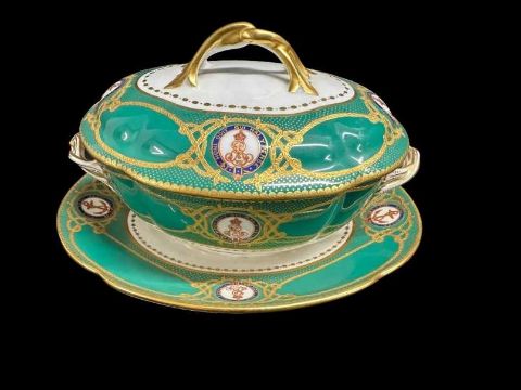 H.M.Y Victoria and Albert III green pattern lidded tureen with incorporated saucer/base, King's cypher and alternating Royal Yacht fouled anchor crest, fine hand-painted detailing, Edward VII, manufactured by Spode and retailed by T. Goode. Tureen cracked A/F. 8ins. x 5ins.