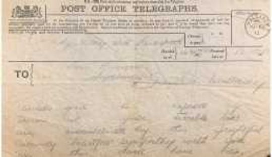 Post office telegram dated April 19th sent to William Harrison's wife Anne from J. Bruce Ismay. "words fail to express my sorrow at your terrible loss. Am overwhelmed by this frightful calamity, heartfelt sympathy with you in this dark hour, Ismay".