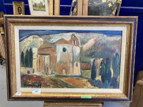 20th cent. Dutch School: Oil on canvas chapel in landscape with Cypress trees. 44cm x 26cm.