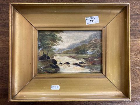 Oil on board landscape with river monogrammed KW, framed.