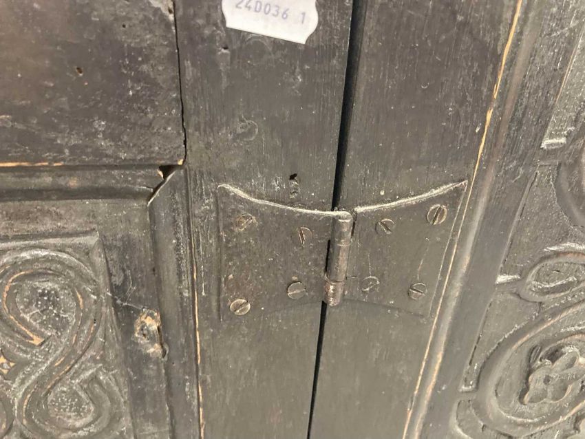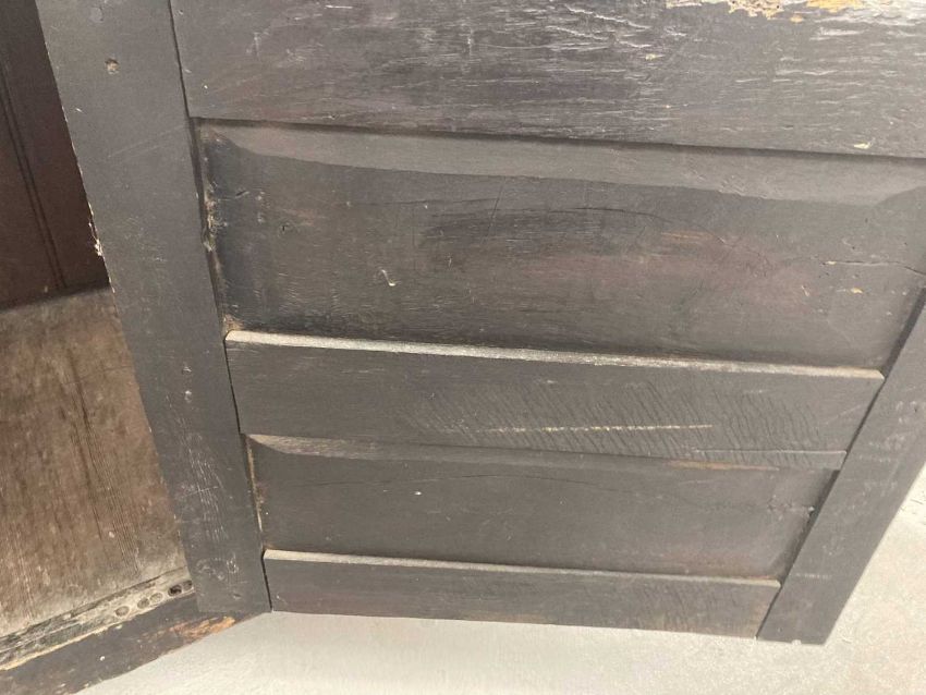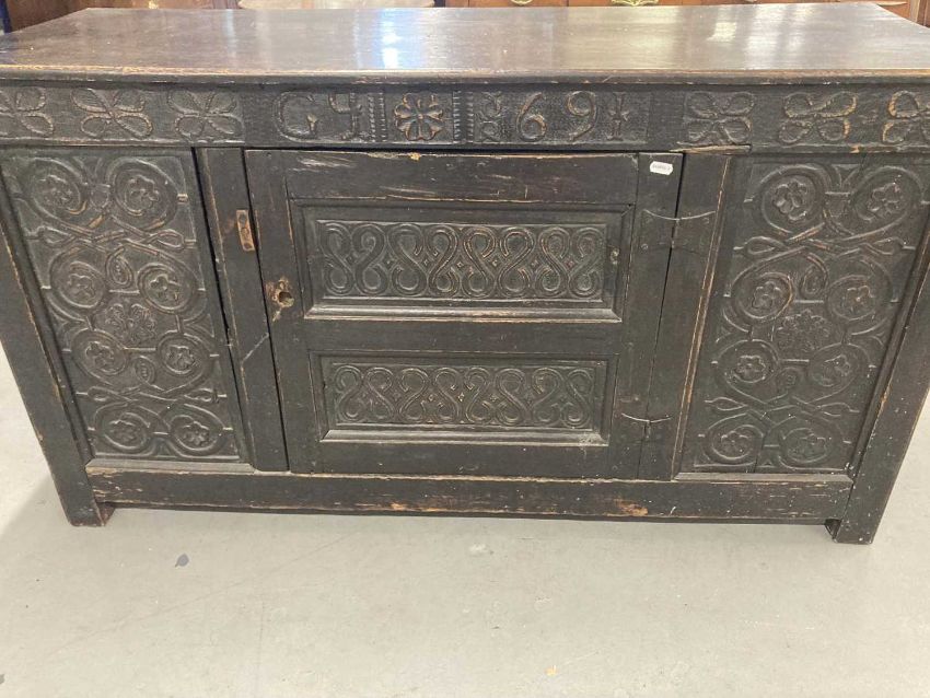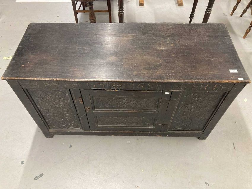 Furniture: 19th cent. George I style oak coffer, carved front panels, panelled sides, later addition back and floor, converted to a cupboard.