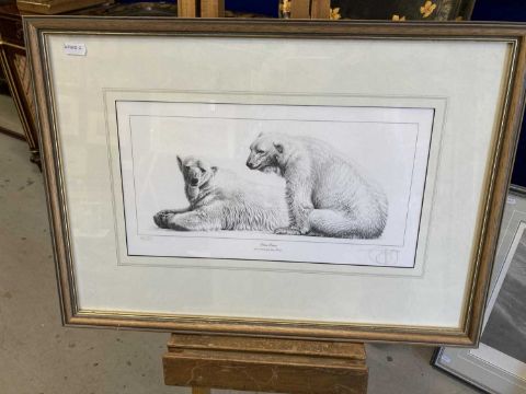 Gary Hodges: Signed limited edition print No. 245/800 'Heat and Dust' 70cm x 60cm and No. 60/850 'Polar Bears' 56cm x 40cm, both in ebonised hardwood frames under glass. (2)