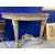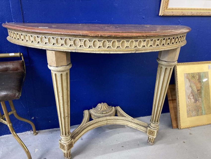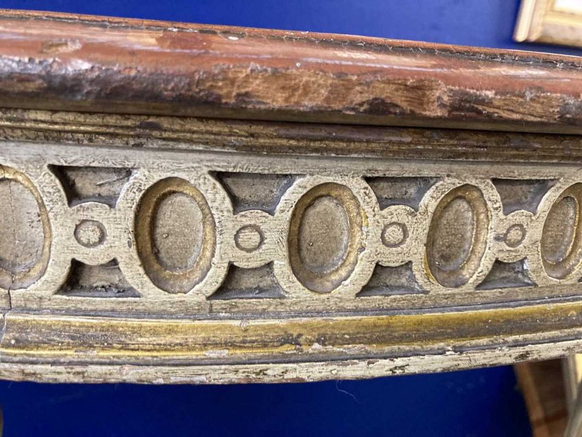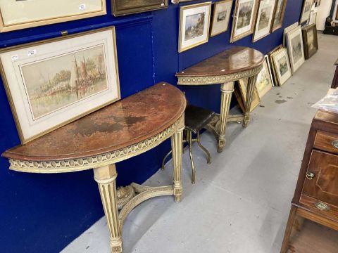 20th cent. Painted demi lune tables, a pair, match to make a centre circular table in the 18th Century manner, distressed painted top with gilt paint to the legs and frieze. 80cm high, 115cm across.