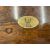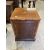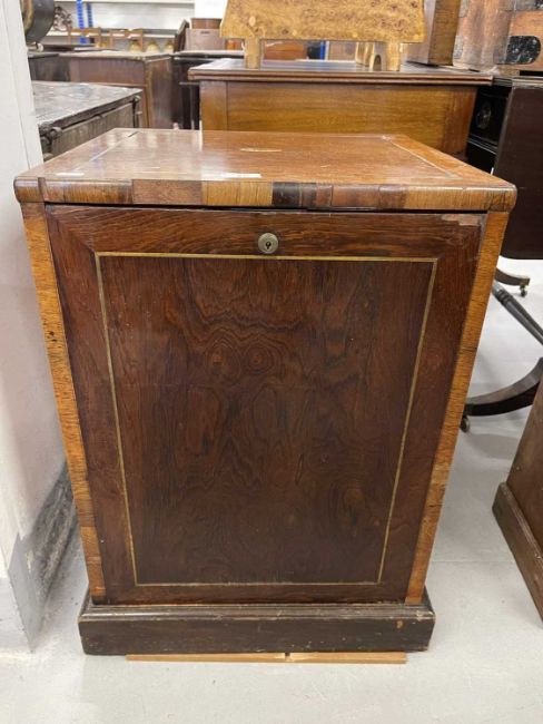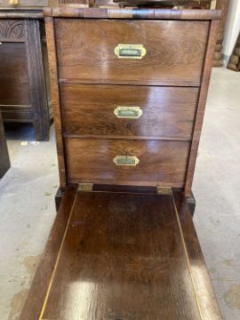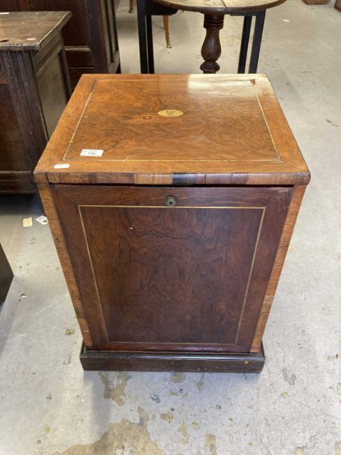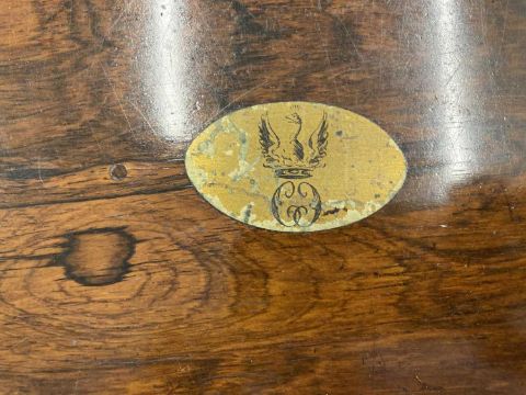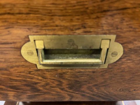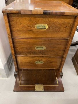 19th cent: Flamed mahogany campaign style chest of three drawers of modest proportions, the top carries a small oval plaque decorated with an armorial showing a Phoenix rising from the ashes. 46cm x 44cm x 44cm.