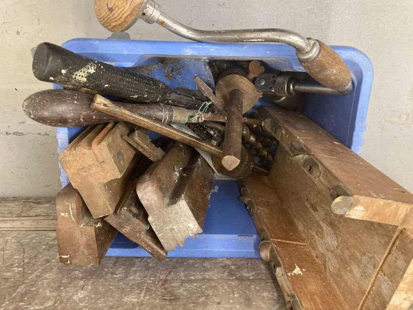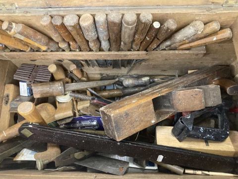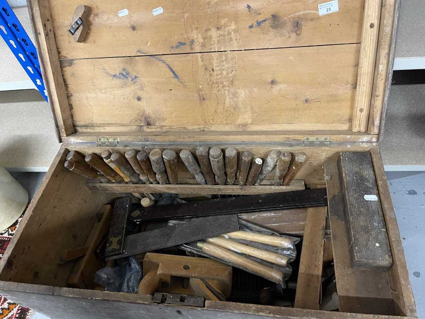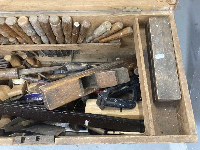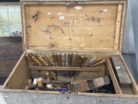 Tools: Carpenter's toolbox filled with chisels, planes, set squares, mallets, etc. Mostly early 20th cent. The box 31½ins x 17ins x 15½ins.