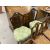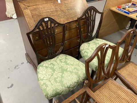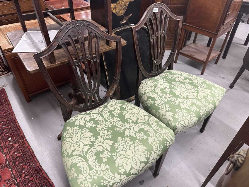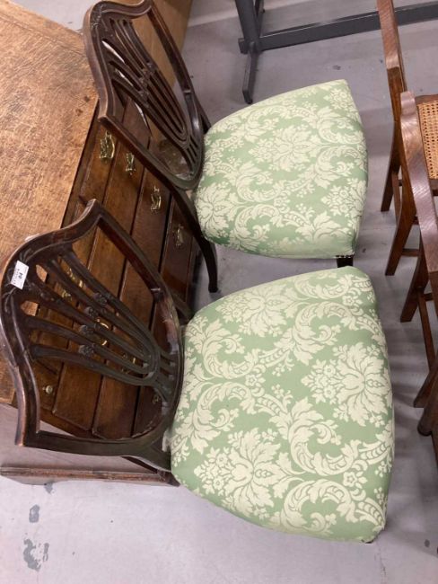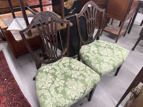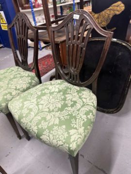Furniture: Late 18th cent. mahogany side chairs, overstuffed seats reupholstered, Hepplewhite design, sabre legs to the rear, straight tapering legs terminating in spade feet to the fore.