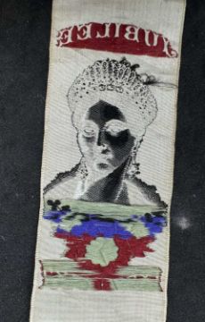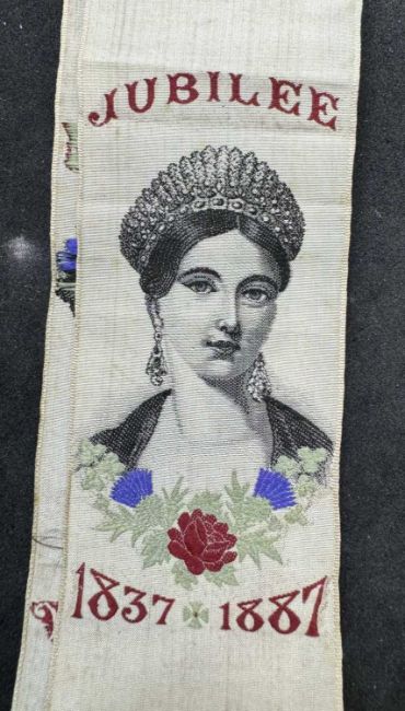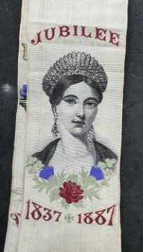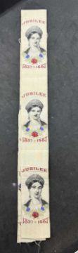 Royal Memorabilia: A Queen Victoria Golden Jubilee silkwork bookmark, the young head of Queen Victoria below the word 'Jubilee' and above the dates 1837-1887. The image repeated 6 times. Overall length 70.5cm. Whether the item is by Thomas Stevens, Cash's or another similar firm we have been unable to ascertain.