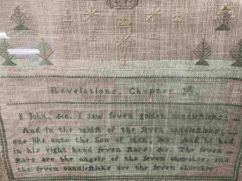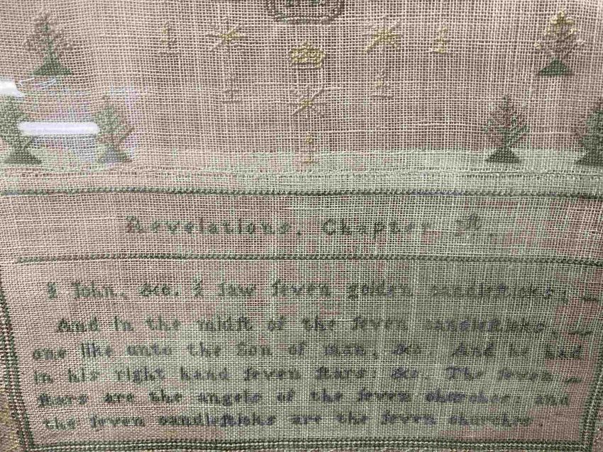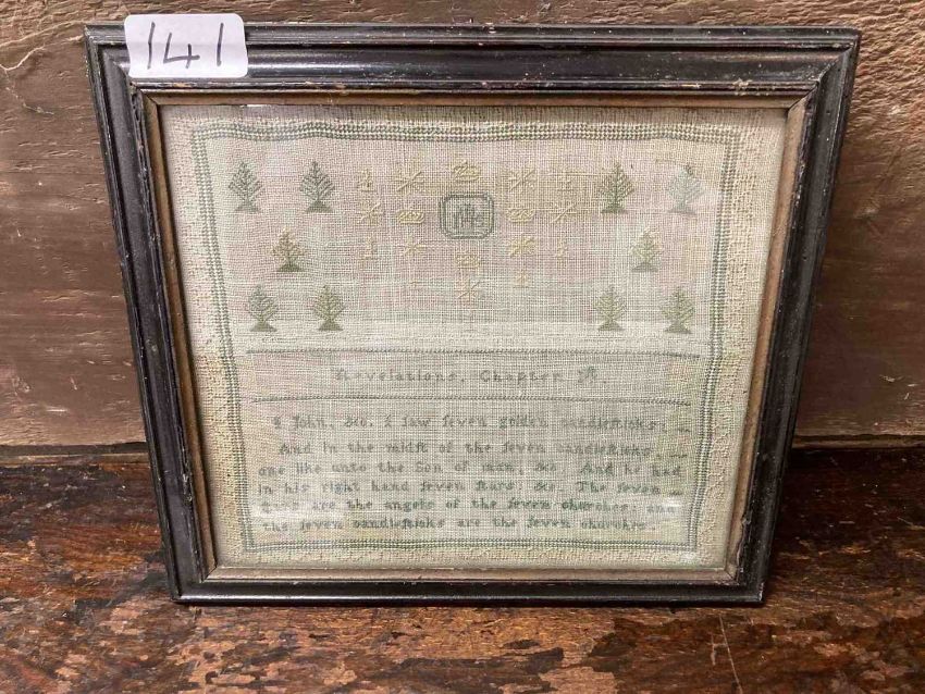 Needlework: An 18th century needlework sampler, worked with trees, seven stars, crowns and seven candlesticks around the Christogram 'IHS' above 'Revelations. Chapter 1st', and excerpts from John's Vision on Patmos 'And in the midst of the seven candlesticks, -one like unto the Son of man, &c. And he had in his right hand seven stars: &c. The seven- stars are the angels of the seven churches: and the seven candlesticks are the seven churches.', possibly Quaker, 18 x 20.5cm, in a glazed ebonised frame.