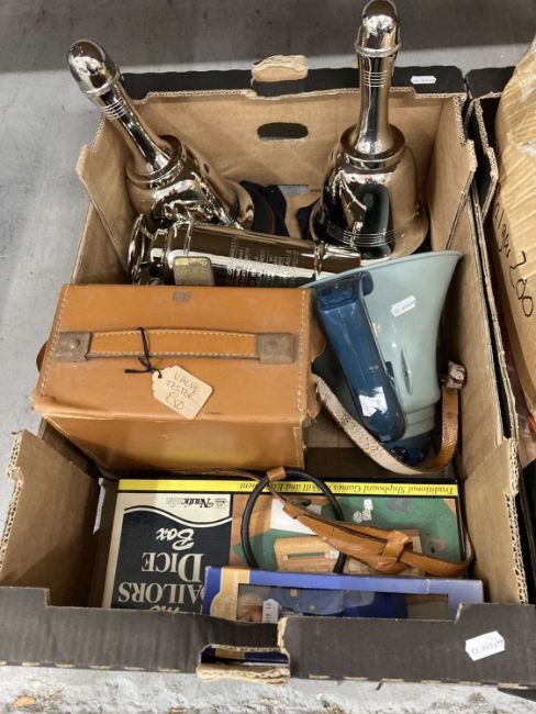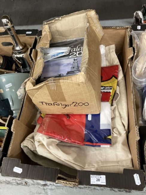 Maritime: Royal Navy kit bag, 2 x Cunard QE2 canvas bags, WWII kit bag, 9 x R.N.L.I. flags, 3 x R.N.L.I. banners, 11 x seaman's collars, Trafalgar 200 mags, Royal Navy newspapers and reprints related to WWII, a doll 'Miss Townsend Thoresen', boxed valve tester, tannoy, 3 x cocktail shakers one in the form of a fire extinguisher and two in the form of bells and a crumb brush.