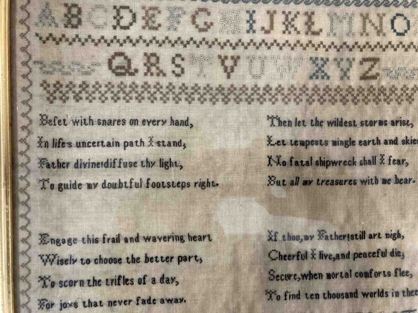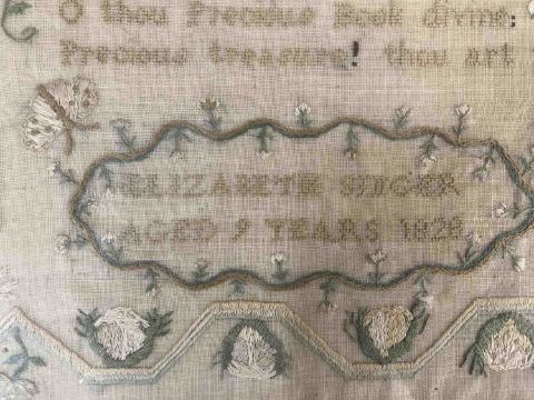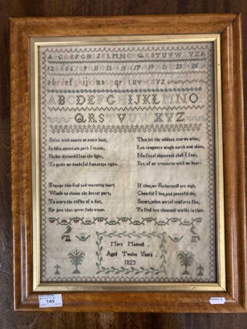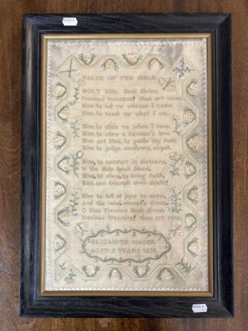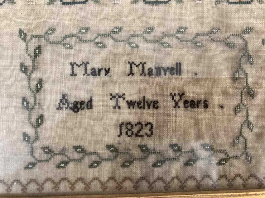 Needlework: Two George IV samplers one with the full alphabet, numerals and verse with birds and trees by Mary Manvell aged 12, dated 1823 within birdseye maple frame under glass, 50cm x 40cm. The other sampler by Elizabeth Singer aged 9yrs, dated 1823 in black ebonised frame under glass, 53cm x 47cm. (2)