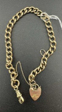 Jewellery: A 9ct yellow gold curb link bracelet with heart clasp and safety chain, approximately 21cm, 10.9g.