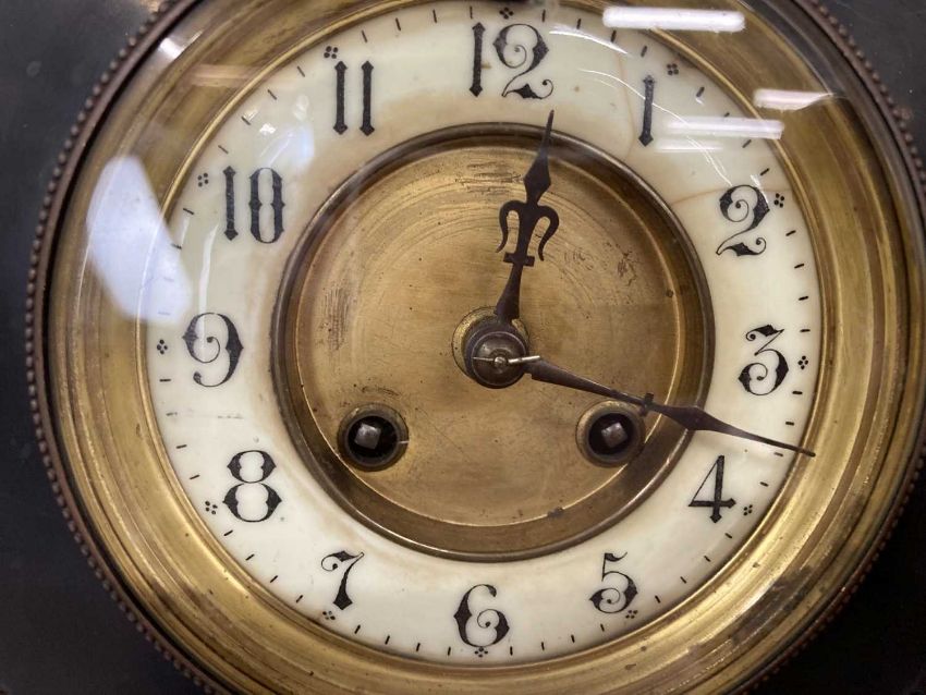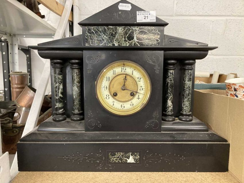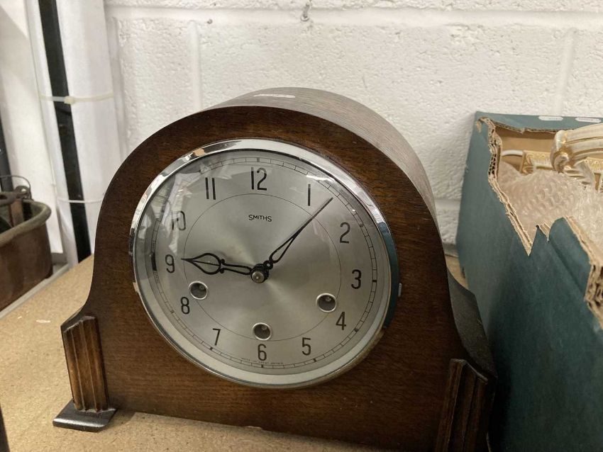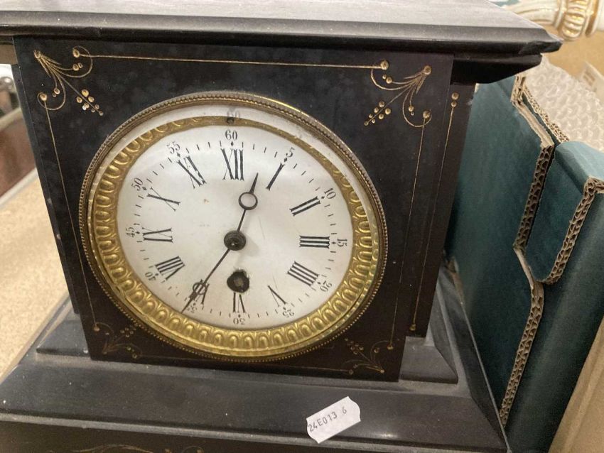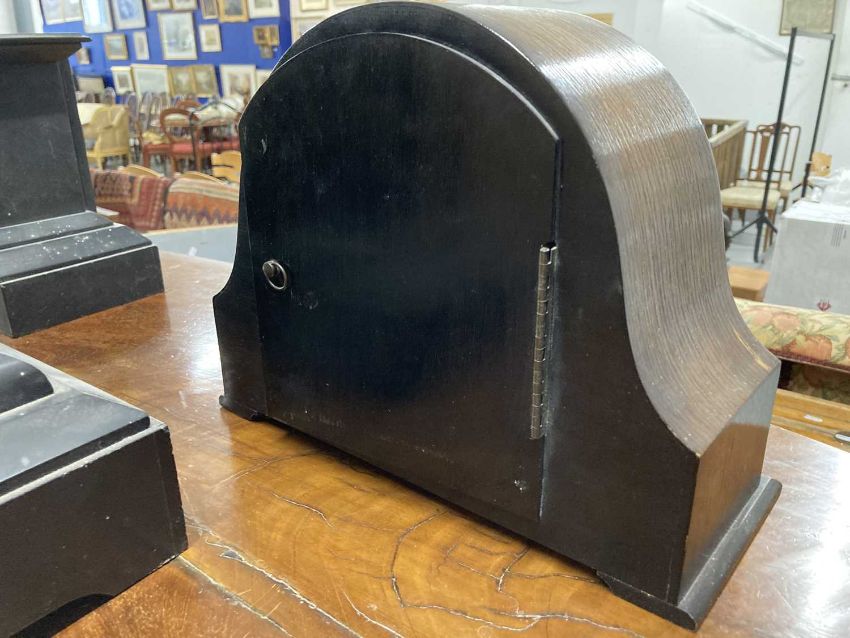 Clocks: Slate and marble mantel clock, enamel dial, a Smiths oak cased mantel clock and a slate mantel clock. (3)