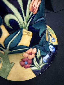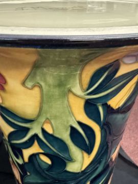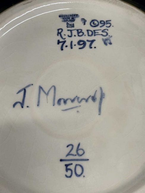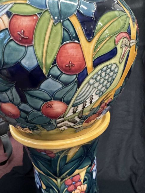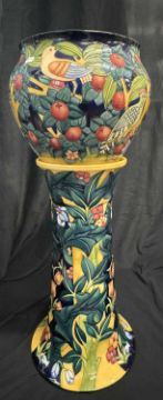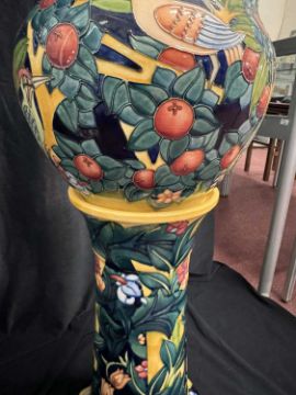 Ceramics: A limited edition Moorcroft Prestige jardiniere and stand in the ‘Tree Bark Thief’ pattern, designed by Rachel Bishop. Numbered 26 of 50, dated 1997, printed and painted marks to the underside. 86cm high overall height.CONDITION REPORT. Appears to be in good condition free from chips, cracks or repairs.