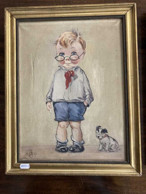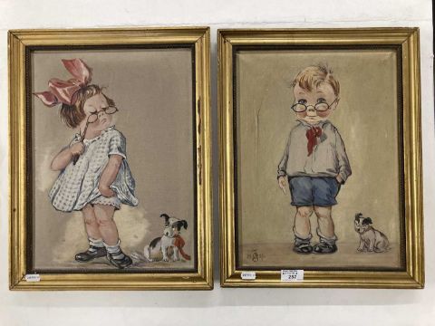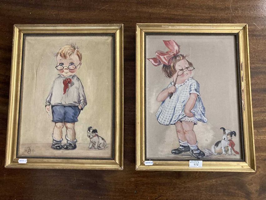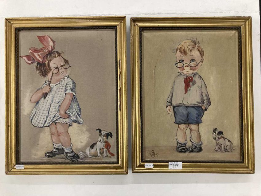 Charles Twelvetrees (American) (1888-1948): Pair of oils on canvas boy and girl chubby-cheeked child figures with whimsy humour, signature dog lower right, one signed with initials and dated 1923, both in matching giltwood frames. 35cm x 45cm. (2)