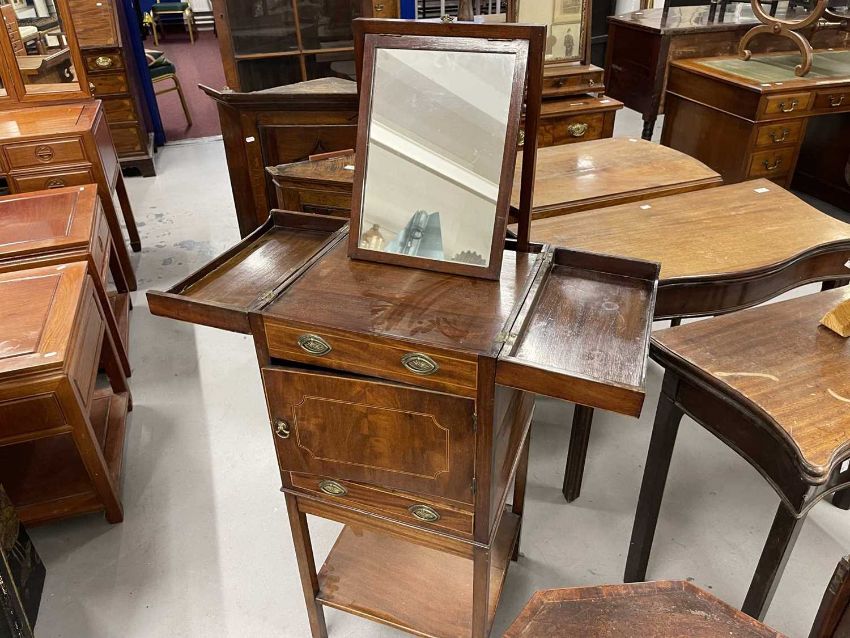 Furniture: A Campaign style mahogany dressing cabinet, the top opens to reveal a pull up mirror, circa 19th century on four supports with dummy drawer to top, 41cms x 95cms.
