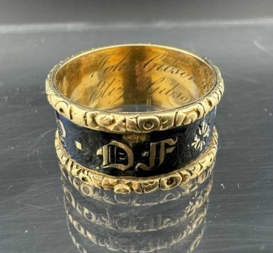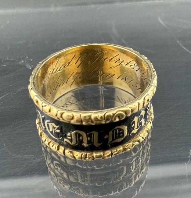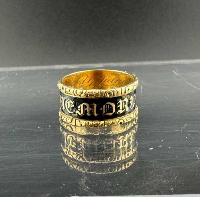 Jewellery: An early 19th century yellow metal and enamel mourning ring, reading 'In Memory Of' around the band and engraved internally with two names and death dates of 1812 and 1813. Tests as high carat gold, 4.9g