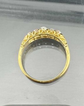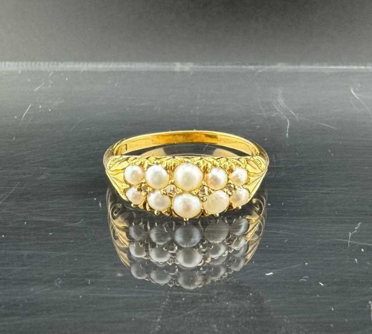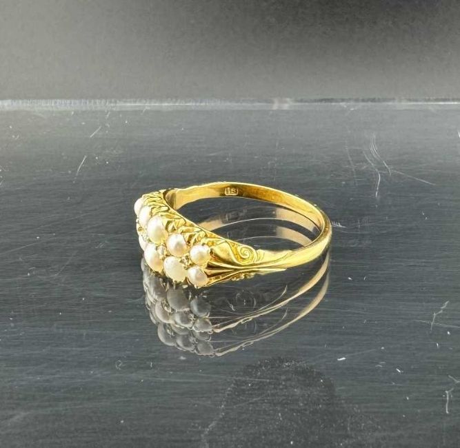 Jewellery: An 18ct yellow gold ring, set with two rows of five graduated seed pearls. UK size R, 4.0g. Only marked '18', tests as 18ct gold.