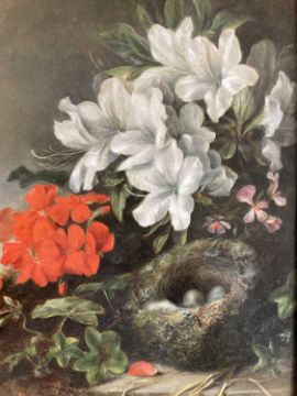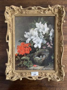 Circle of Oliver Clare: Still life with flowers and a bird's nest Oil on board 29.2 x 21.8cm; 11½ x 8½ins.