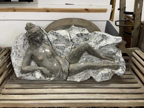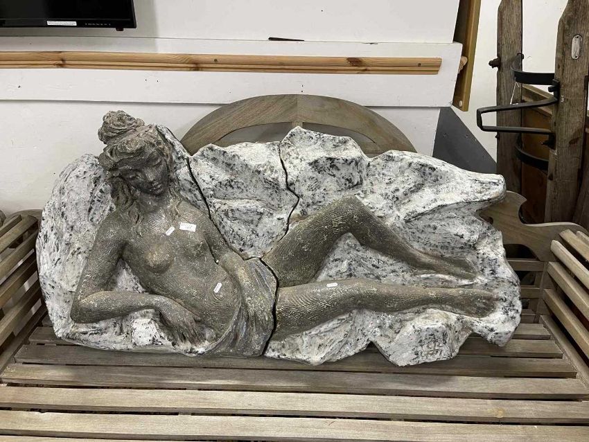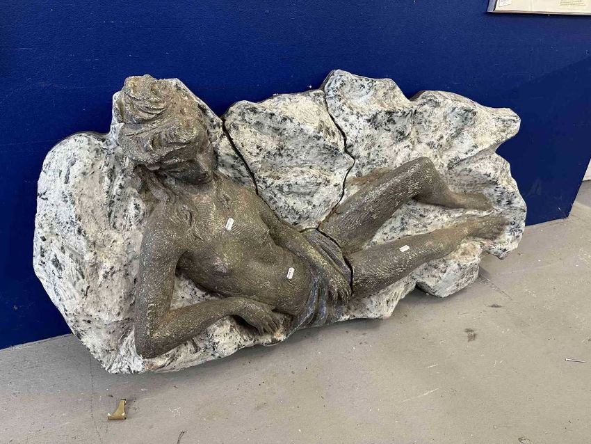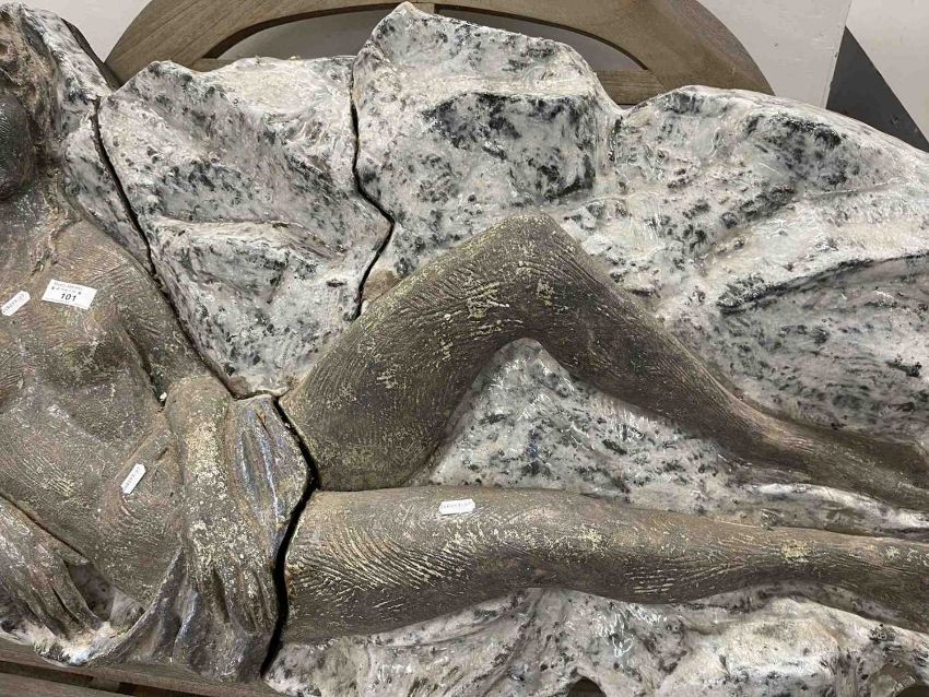 Ceramics: A mid-century ceramic. Wall plaque of a reclining figure on a marbled background. Applied to a sheet of laminate ply with metal. Hanging brackets to the reverse overall size length 1.3m height 65cm depth 40cm