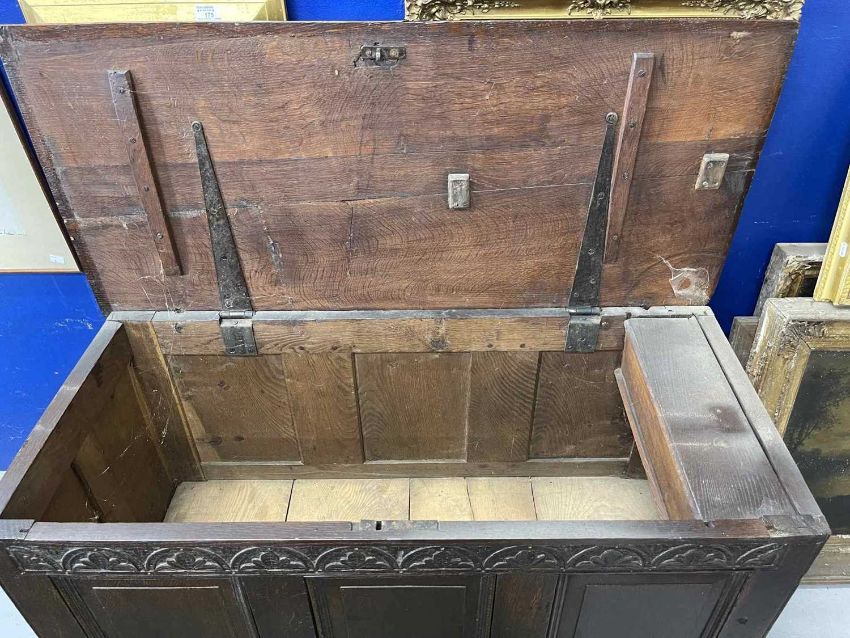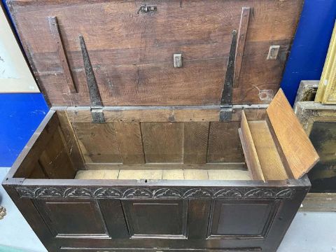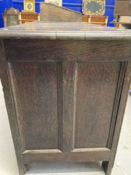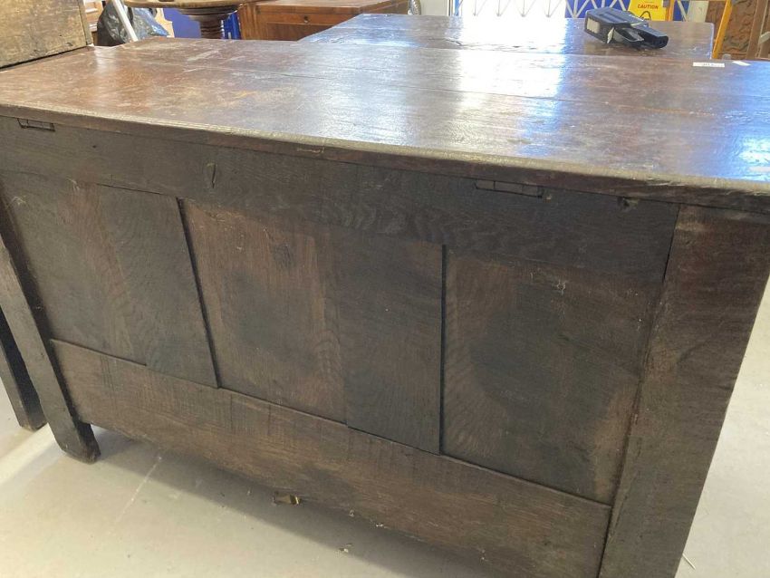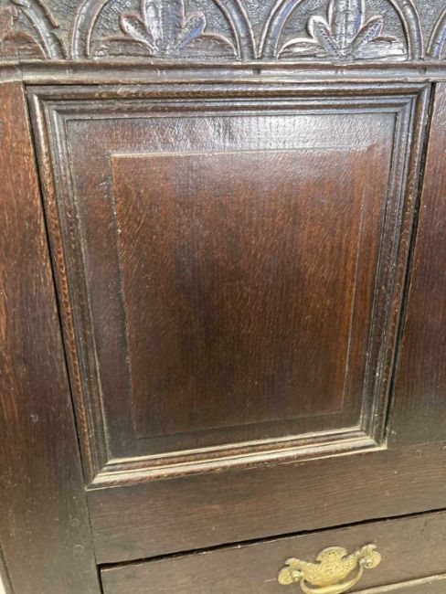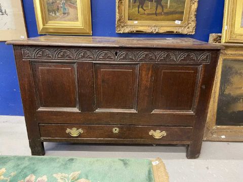 Late 18th cent. English oak dowry chest with three raised fielded panels to the front elevation under a carved lunette top rail all above a single full length oak lined drawer retaining original brass swan neck handles and back plates, raised on styled legs with the addition of an original candle box to the interior, good even historic colour and patina. Overall length 114cm, height 74cm, depth 50cm.