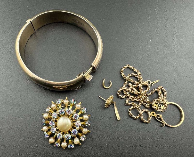 Jewellery: A 9ct gold box link style chain necklace, 45cm, a single 9ct gold earring and a yellow metal coin mount, marked 15ct and tests as such. Together with a hinged silver bangle and a costume jewellery brooch. 9ct gold weight 6.5g, 15ct gold 1.3g, silver weight 25g.