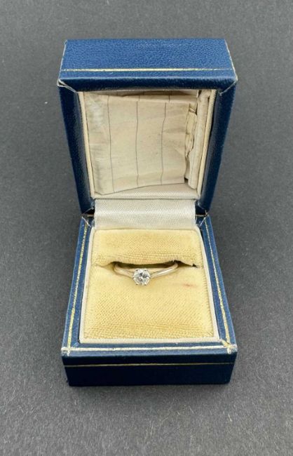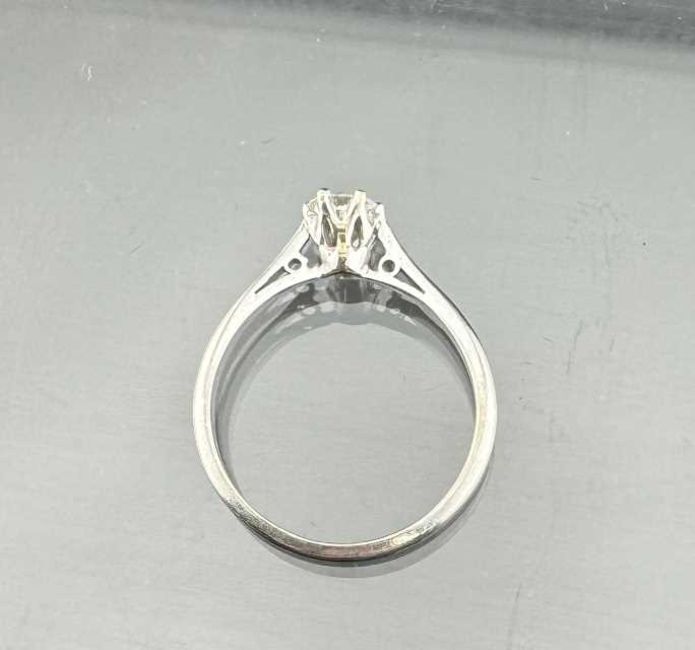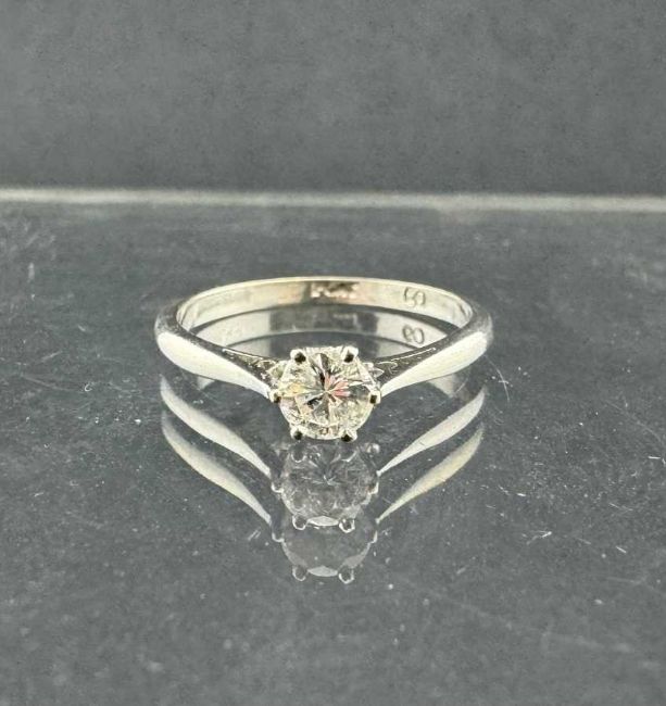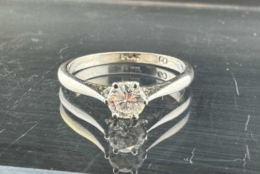Jewellery: Platinum and diamond solitaire ring, the stone set in a raised mount with pierced effect below. The stone approximately 0.6cts, the ring UK size N, 2.8g.
