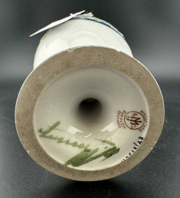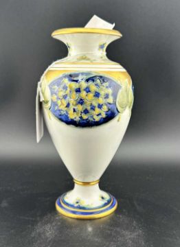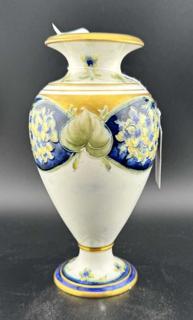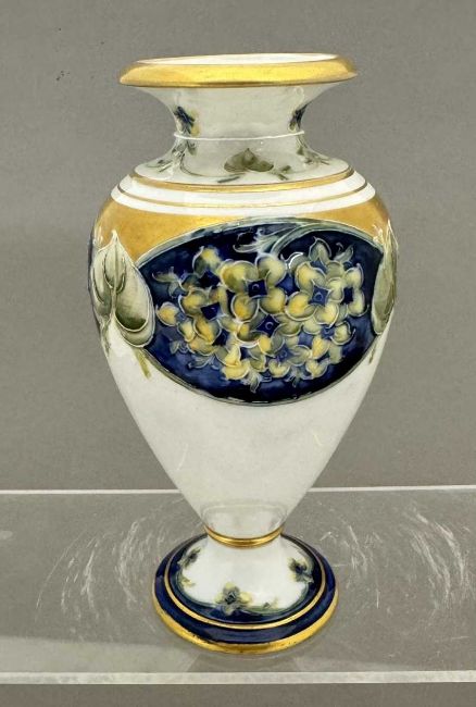 Ceramics: William Moorcroft for Macintyre, a 'Lilac' Florian vase, of baluster form upon a pedestal foot, tube lined against a cream ground. Signed 'W. Moorcroft' in green, with the brown Macintyre mark to the underside. 15cm. Single small shallow chip to the footrim.