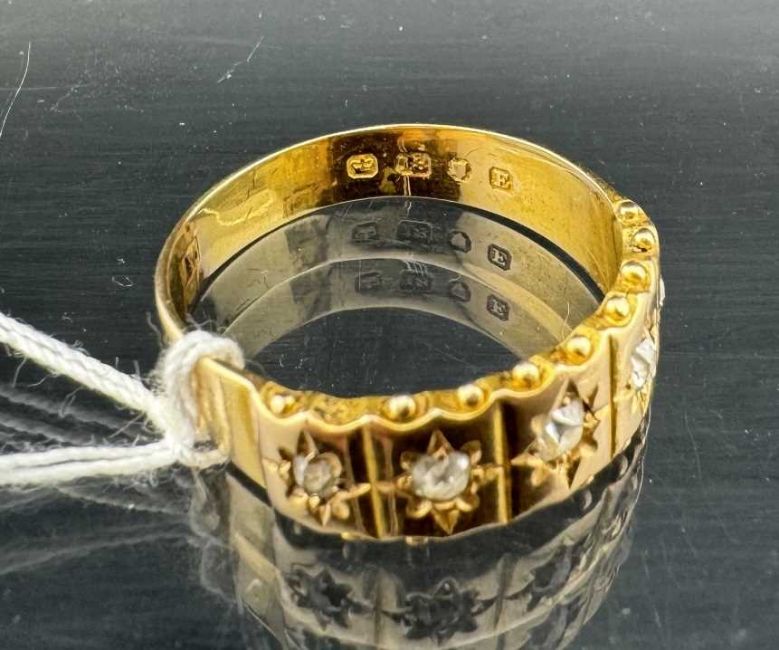 Hallmarked Gold: An 18ct yellow gold ring set with five graduated old cut diamonds, hallmarked for London 1880. UK size R½, 5.1g.