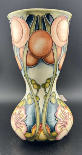 Ceramics: A 2003 Trial Moorcroft Pottery Cannonball Tree pattern tube lined vase of waisted form, painted to a pale washed blue ground, 18cm. Printed and painted marks to the underside.