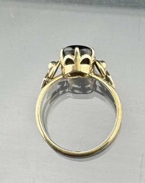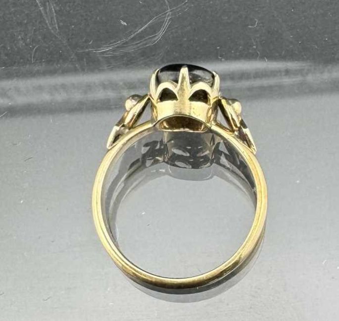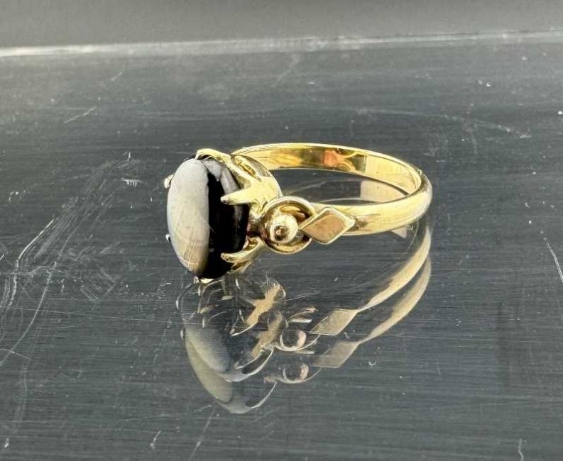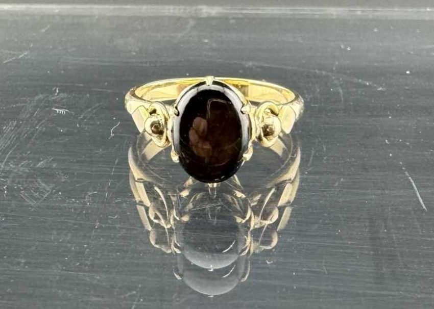 Jewellery: Yellow metal ring set with a single cabochon star corundum or similar, marked 18K and tests as 18ct gold, size M. 3g.