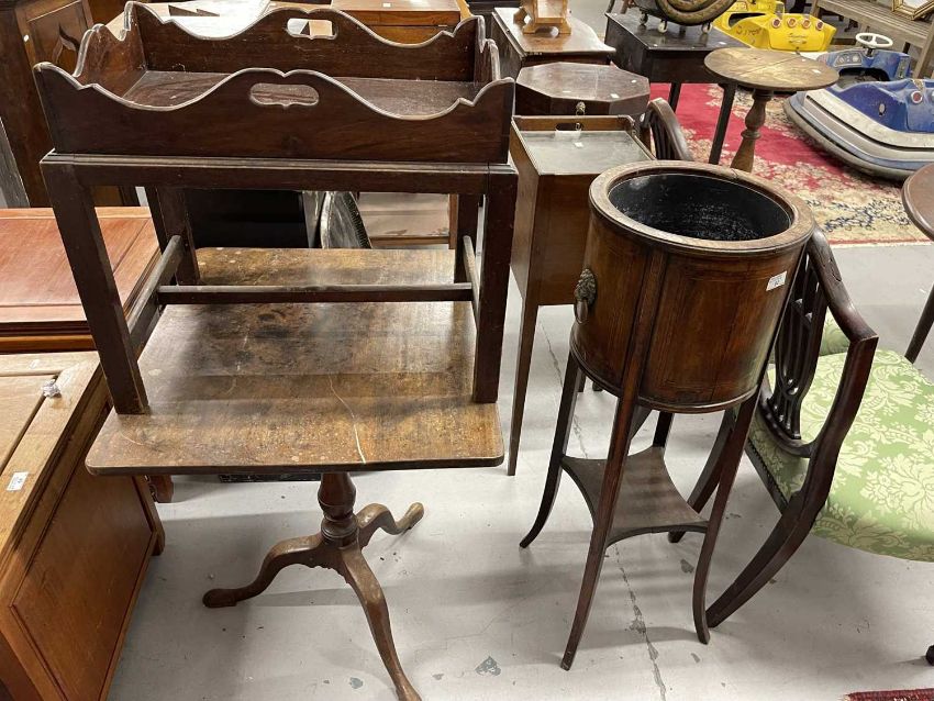 Furniture: 19th cent. Butler's tray on a short stand, a mahogany pot cupboard on square tapering supports, an elegant plant stand metal liner with shelf below, the whole on long splayed supports and a 19th cent. elm topped single pedestal table on three splayed supports rising off pad feet.