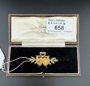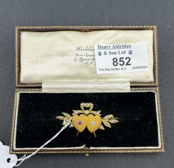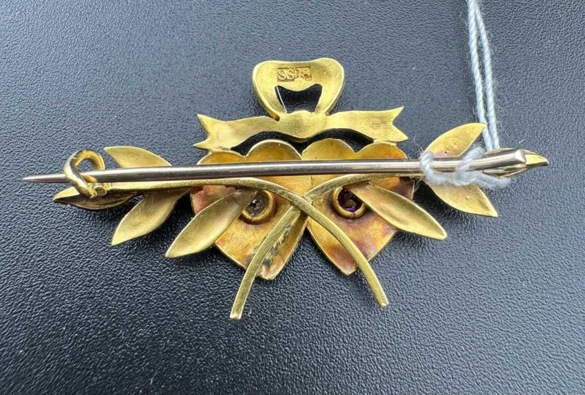 Jewellery: An 18ct yellow gold double heart bar brooch, leaves to each side and below a ribbon. The hearts brushed, and set either a ruby or diamond, the leaves and ribbon with seed pearls. 4.2cm wide, 5.1g. Marked 'SS 18' and tests as 18ct gold.