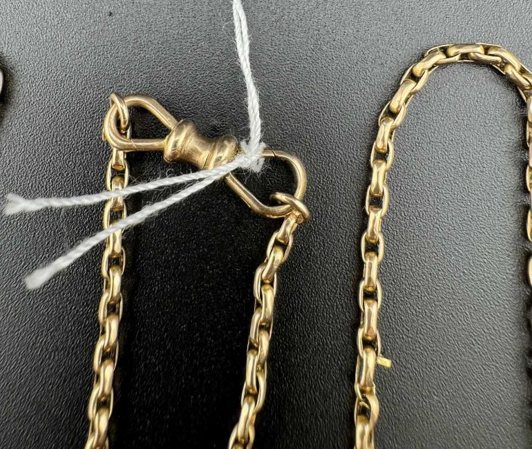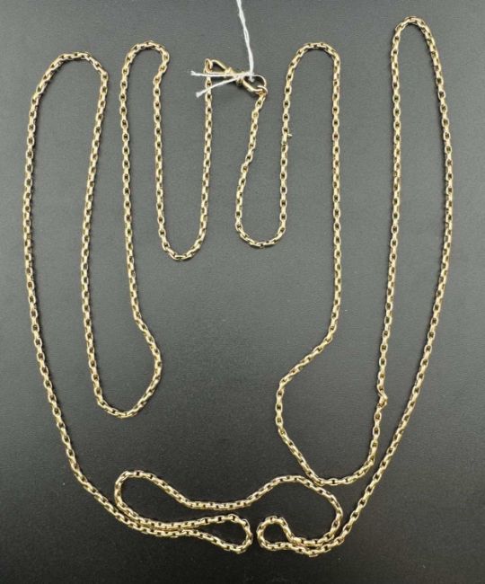 Jewellery: A 9ct gold long guard chain with swivel clasp, 152g. Marked 9c to both clasp and chain and tests as such. Weight 22.8g.