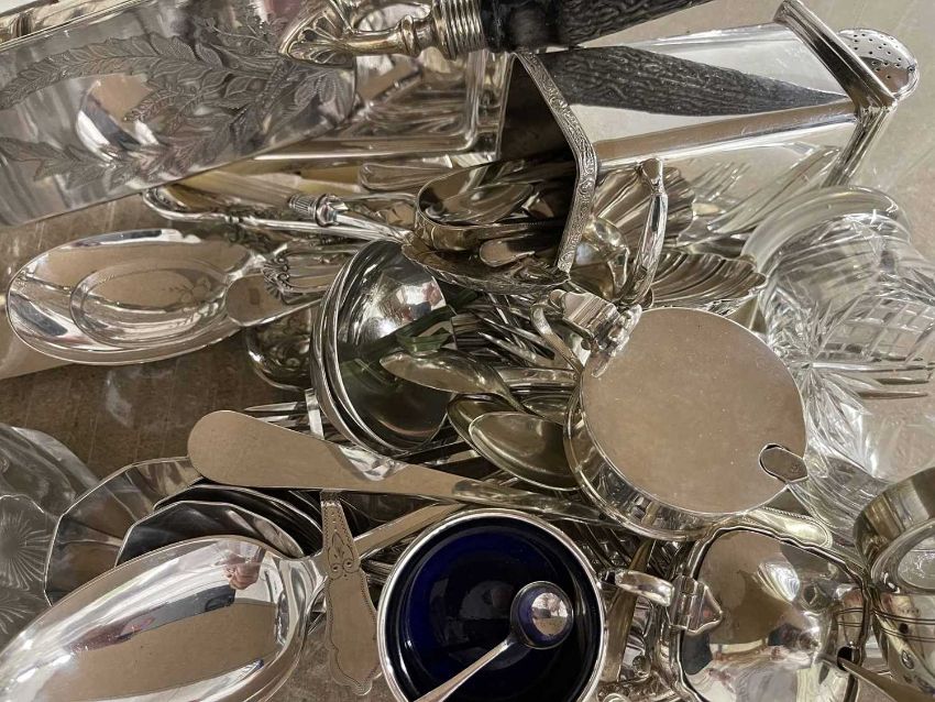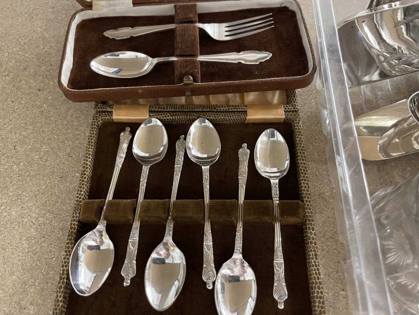Silver Plate: A boxed set of apostle spoons, a boxed christening set, cruets, antler handled crumb scoop, and other plated items.