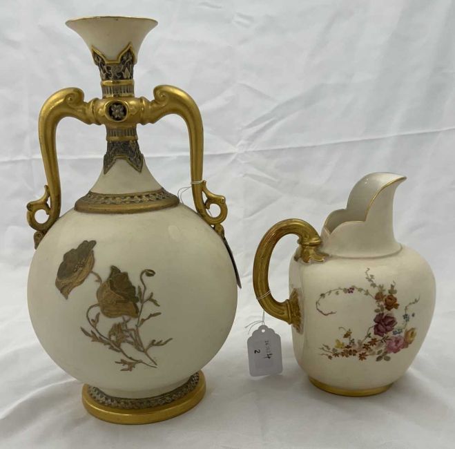 Ceramics: A Royal Worcester blush ivory Wisteria pattern vase, with stylised dolphin handles and moulded floral decoration. Puce backstamp with impressed '877', 29cm. Hairline to base. Together with a Royal Worcester blush ivory jug, shape 1094, date code for 1892 with the initials of JH, possibly James Hadley, 18cm.