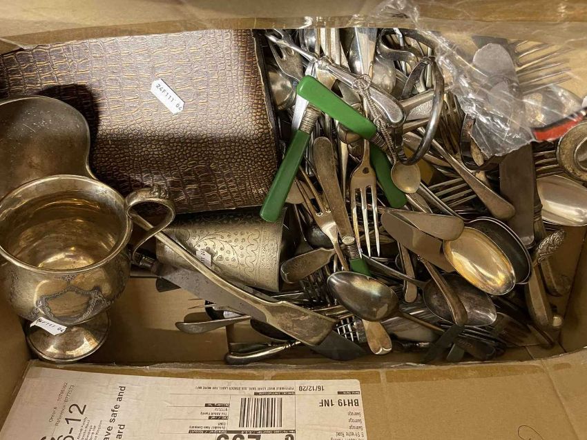 Silver Plate: Three 19th century silver handled table knives, a silver plated trophy, a boxed set of ivorine handled butter knives, and other cutlery and plated items.