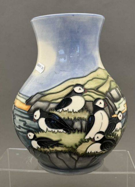 Ceramics: A Moorcroft pottery Puffin vase, designed by Carole Lovett, dated 1997. Printed and painted marks to underside, 24cm. Complete with original box.CONDITION REPORT. Appears to be in good condition free from chips, cracks or repairs.