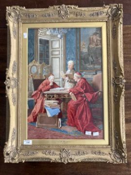 Art: A gesso framed 19th century watercolour of two cardinals and another gentleman reading books around a table, signed bottom left, entitled 'A Consultation'. Image size 53cm by 35.5cm, frame size 73cm by 55.5cm. Label to rear for Grindley & Palmer, framers.