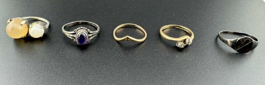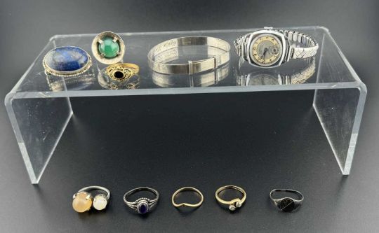 Jewellery: A 9ct gold two diamond crossover ring, a 9ct gold wishbone ring, combined weight 2.9g; a silver christening bangle, other silver jewellery and a ladies Rotary watch.