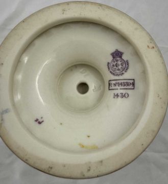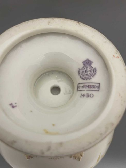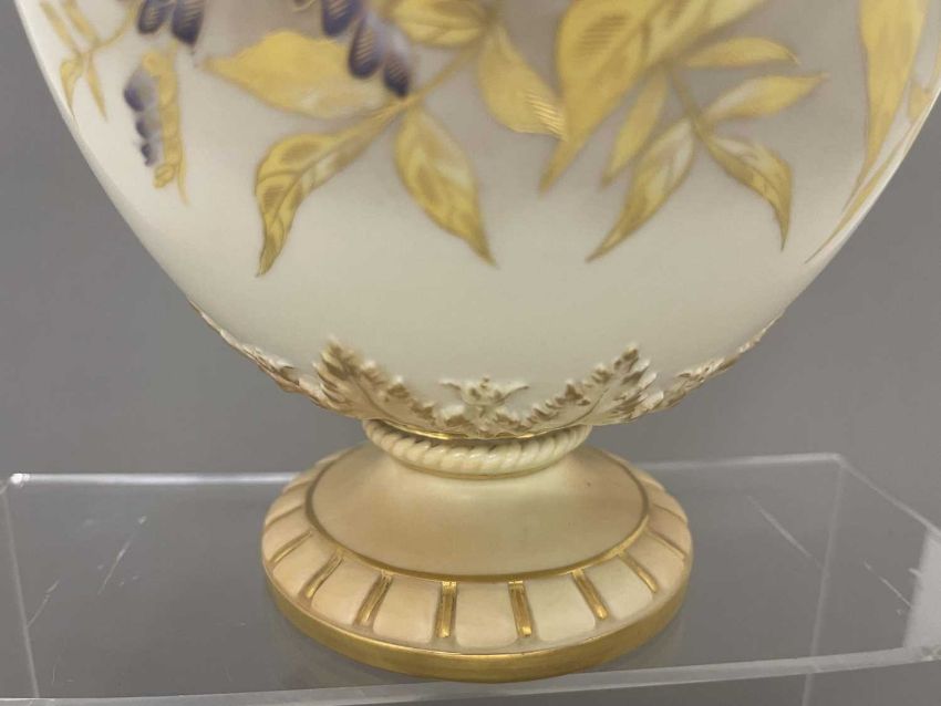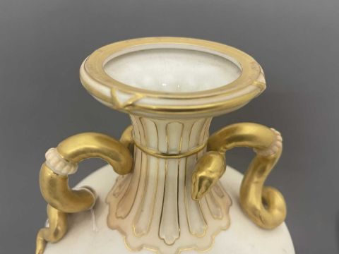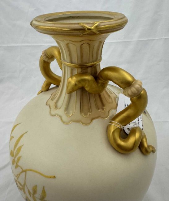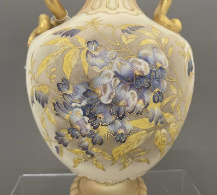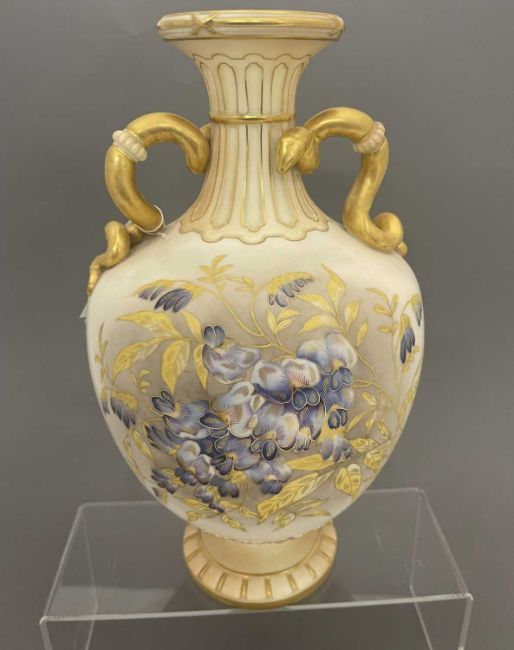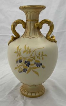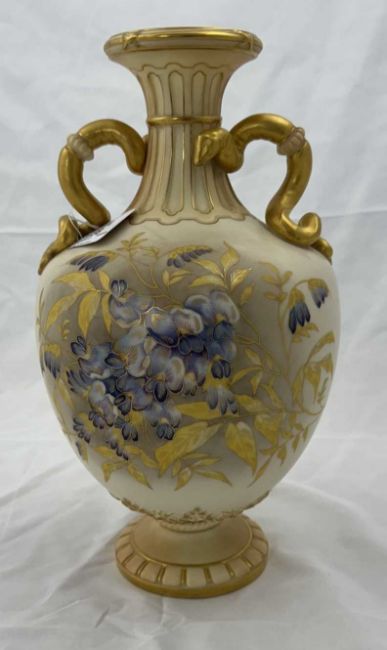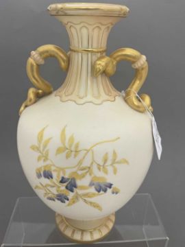 Ceramics: A Royal Worcester blush ivory dahlia decorated vase, with gilded cobra handles, the underside with puce mark dating to 1891 and the shape number 1430, 30cm.