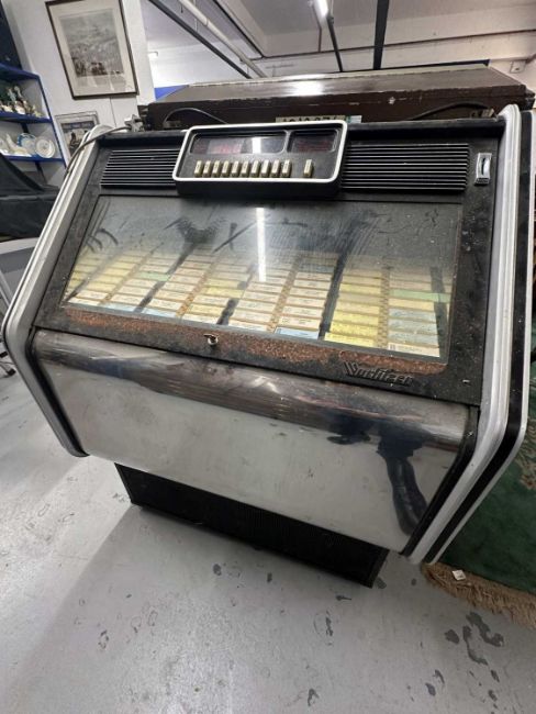 Memorabilia: Mid century Wurlitzer jukebox, complete, Model 62409, Type 401, Kom 1 129, untested. Garage stored some rusting on the chrome.