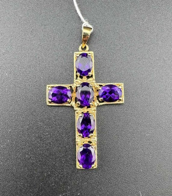 Jewellery: A 9ct gold cross pendant set with six oval amethysts, 4.3cm by 2.7cm, bearing partial Birmingham hallmarks. 6.5g