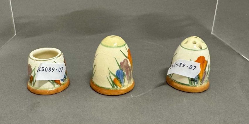 Ceramics: 'Crocus' a Clarice Cliff Bizarre miniature part cruet set, comprising salt and pepper pots and a mustard pot, painted in colours, a Blue Firs Conical mustard pot and a Wilkinson's Tankard milk-jug and sugar basin, printed factory marks, 4cm. high (salt), (6)