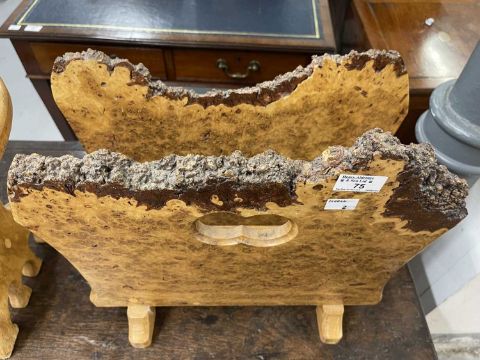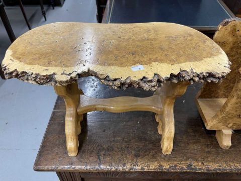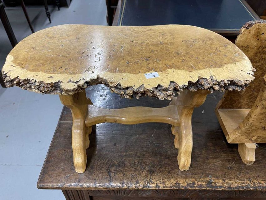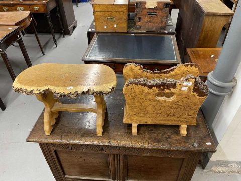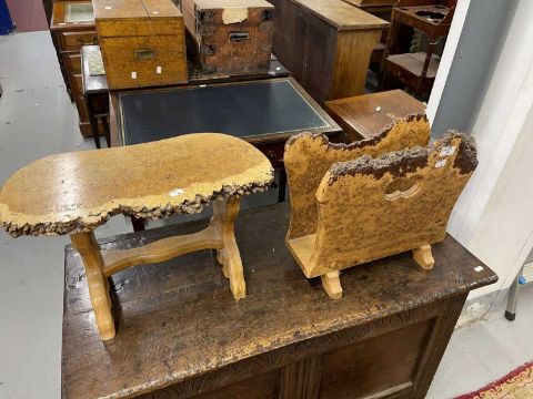 20th cent. Burr wood magazine holder and side table