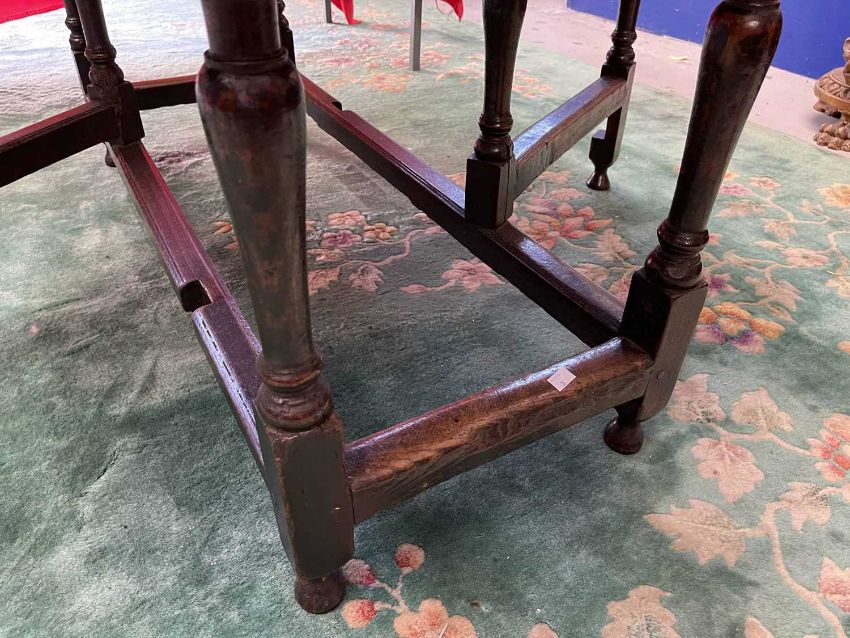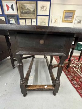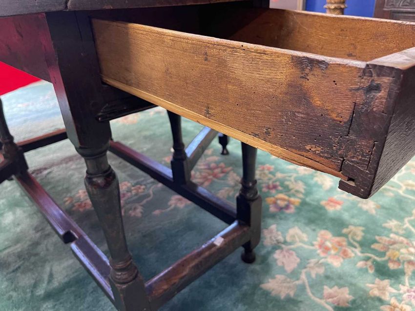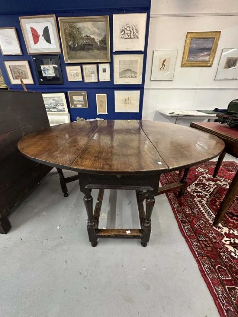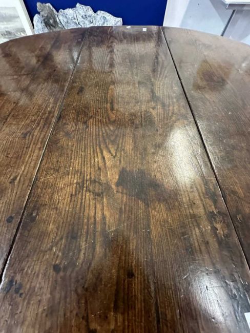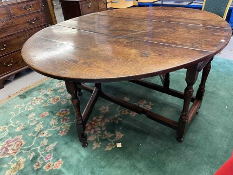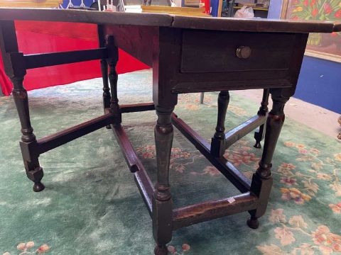 Furniture: Late 18th century English oak gate leg table with original drawer to end rail. original hinges, untouched condition, joints and wing tips all sound, level surface when open, stands well/solid with no wobbles, good height and exceptional colour. Open 137cm x 160cm height 75cm.