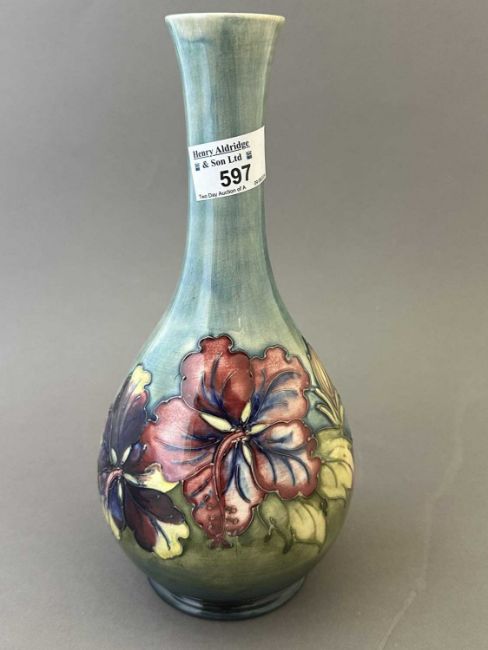 Ceramics: A Moorcroft Pottery Hibiscus Pattern baluster vase, to a pale blue ground. Impressed marks and painted signature to the underside, 25cm. CODE 3068CONDITION REPORT. Light glaze crazing, and a flaw to the underside of the footrim, probably during potting.