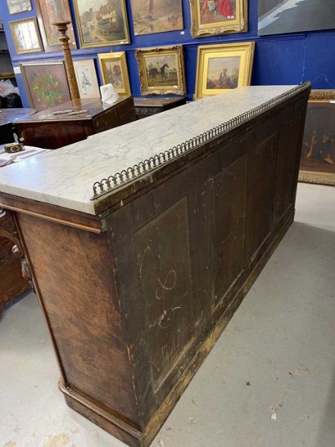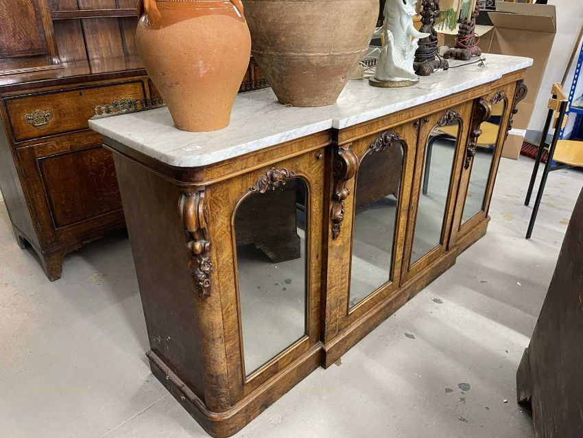 Furniture: Victorian burr walnut breakfront credenza/sideboard with marble top. gilt brass gallery to the back. over four mirrored doors with applied decorative carved detail to the front elevation, interior with fitted shelves c1880, no maker mark. Length 200cm, height 95cm, depth 45cm.